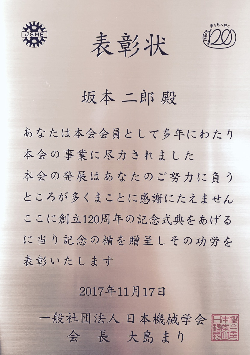 新学術創成研究機構 未来社会創造研究コア バイオイノベーティブデザインユニット 坂本 二郎 教授が,2017年11月17日,明治記念館において行われた日本機械学会創立120周年記念式典において,日本機械学会から120周年記念功労者として表彰されました。 坂本教授は,長年にわたり機械工学分野の発展に尽力し,その功績を讃え授与されました。