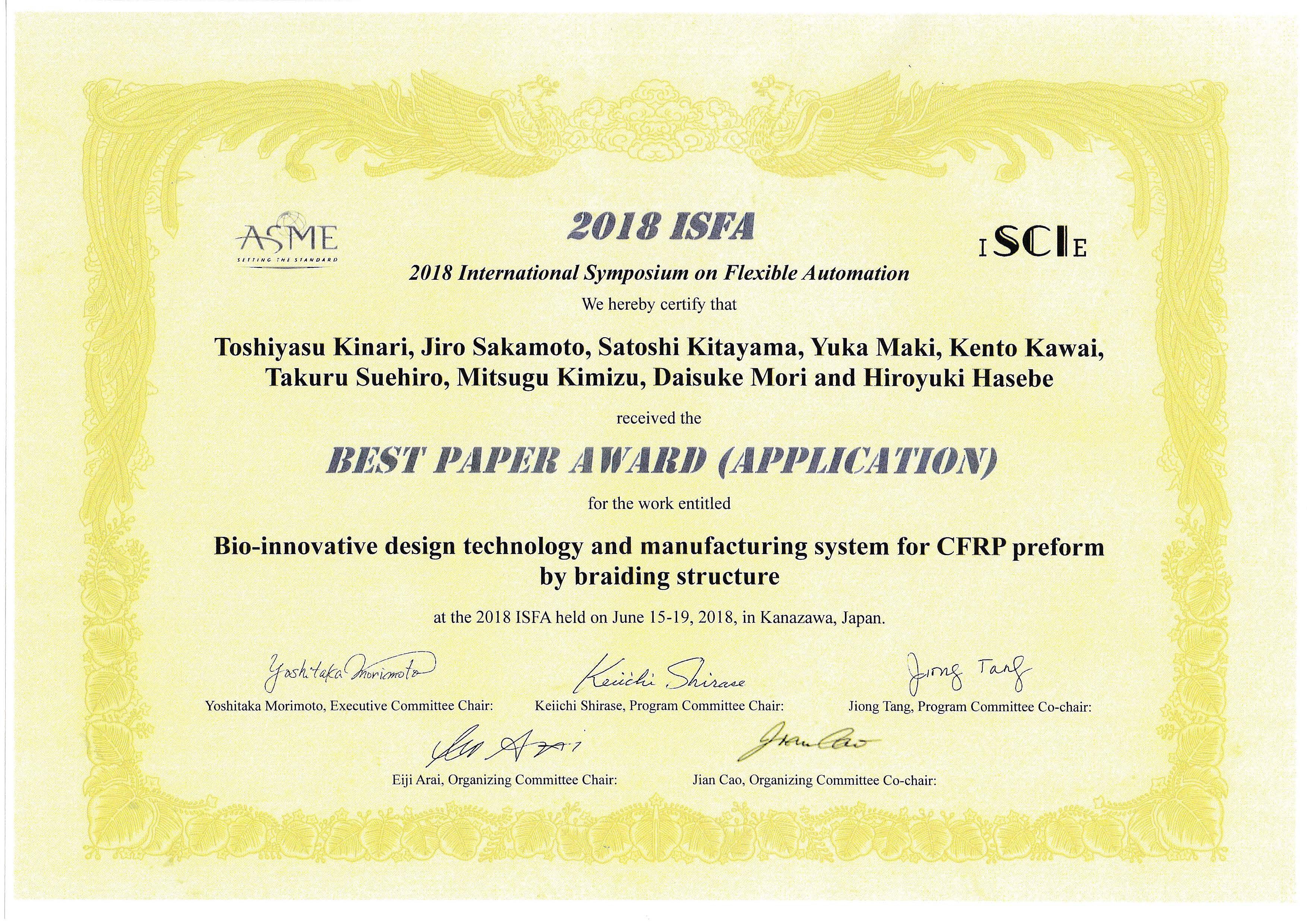 新学術創成研究機構 未来社会創造研究コア バイオイノベーティブデザインユニット 坂本二郎教授が,2018年6月,International Symposium on Flexible Automation (ISFA 2018)において,理工研究域 喜成年泰教授,北山哲士教授,他6名と「International Symposium on Flexible Automation (ISFA 2018)Best Paper Awards (Application)」を受賞されました。