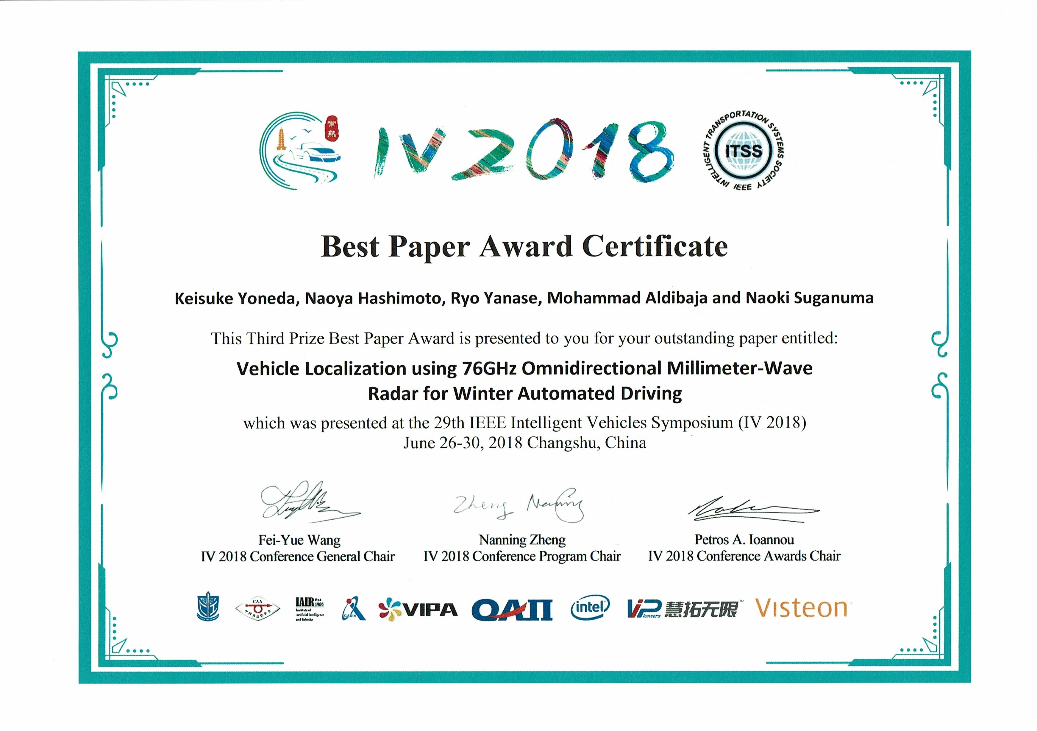 新学術創成研究機構 未来社会創造研究コア 自動運転ユニット 米陀 佳祐 助教が,2018年6月26日,自動運転に関する国際会議IEEE IV2018 の投稿論文において,優れた研究発表をしたものに授与される,29th IEEE Inteligent Vehicles Symposium (IEEE IV2018) Best Paper Award (優秀論文の第3位として受賞) を受賞されました。